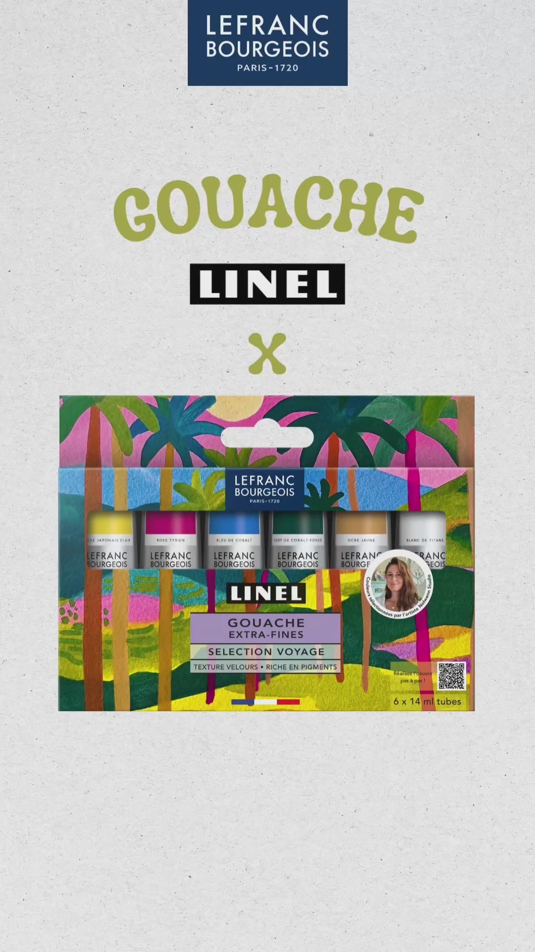 The Travel Set, designed with artist Nolwenn Studio, invites you to create an exotic landscape using Linel extra-fine gouache. Nolwenn is a globetrotting artist influenced and inspired by her travels and her long stay in Colombia. Recurring themes in her creations include tropical beaches, sunsets, exotic birds (such as cockatoos), and architectural environments inspired by Mediterranean or Moroccan motifs (geometric tiles, mosaic fountains, arches and terraces). This box set brings together six shades carefully chosen by the artist Nolwenn Studio: Titanium White, Cobalt Green, Yellow Ochre, Cobalt Blue, Tyrian Pink and Light Japanese Yellow. An ideal palette for creating landscapes in the style of Nolwenn Studio.