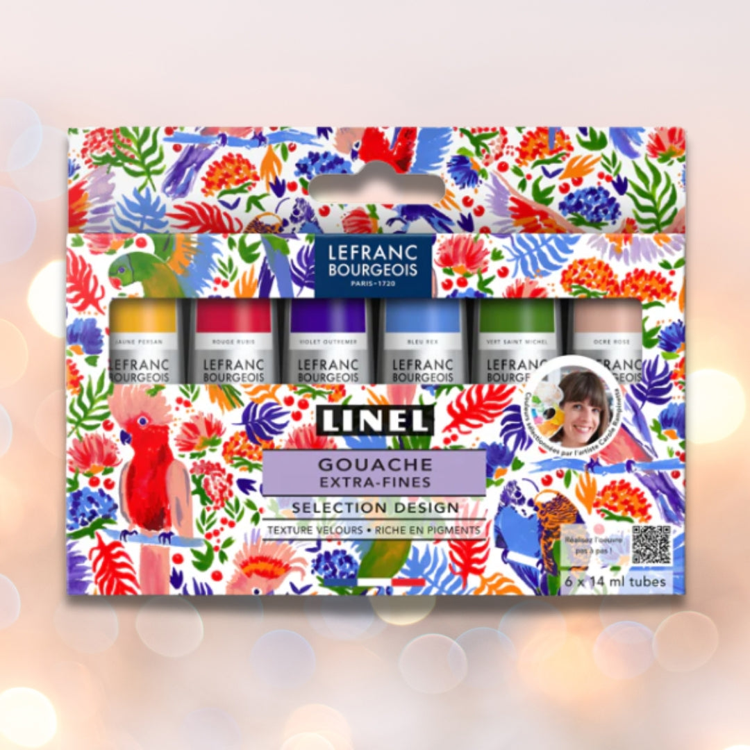 Artist Carole Rampinetta's Designer Set encourages you to create and duplicate the colourful bird motif. Rex blue is present in the vast majority of her creations, so it was an obvious choice to include it here along with 5 other shades: Pink Ochre, Ultramarine Violet, Saint Michael Green, Persian Yellow and Ruby Red. These vibrant colours make colourful birds dance on her leaves, so it's up to you to create your own ball using Linel gouache! A QR code links to a step-by-step tutorial on how to create the artist's work.