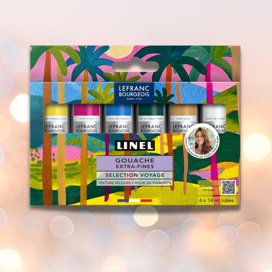 The Voyage Set, designed in collaboration with the artist Nolwenn Studio, an avowed globetrotter, invites you to create an exotic landscape. The recurring themes in Nolwenn's creations are tropical beaches, sunsets, exotic birds (such as cockatoos), as well as architectural environments inspired by Mediterranean or Moroccan motifs (geometric tiles, mosaic fountains, arches and terraces) This is why she has chosen the following colours in her set: Japanese Light Yellow, Tyrian Pink, Cobalt Blue, Cobalt Green Dark, Yellow Ochre and Titanium White. A QR code links to a step-by-step tutorial on how to create the artist's work.