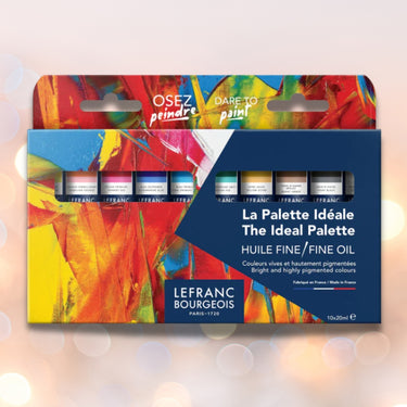 This set, ideal for starting the oil technique, is a selection of 10 ready-to-use, essential Lefranc Bourgeois fine oil colours in 20ml: primary yellow, vermilion orange, primary red, ultramarine blue, primary blue, viridian hue, yellow ochre, burnt umber, ivory black and titanium white Ideal for beginners looking for a wide range of colours