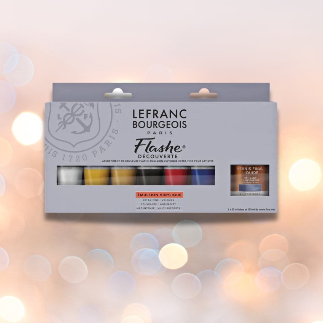 Discover iconic colour with our Flashe Extra-Fine Discovery Set. This Flashe paint & additive set includes six exquisite matt colours and one varnish. Made with high quality single pigments, Flashe Vinyl is renowned for its incredible coverage power. Drying perfectly uniform and stroke free, our Discovery Set is the ideal gift for artists and students looking to explore a new, expressive medium.