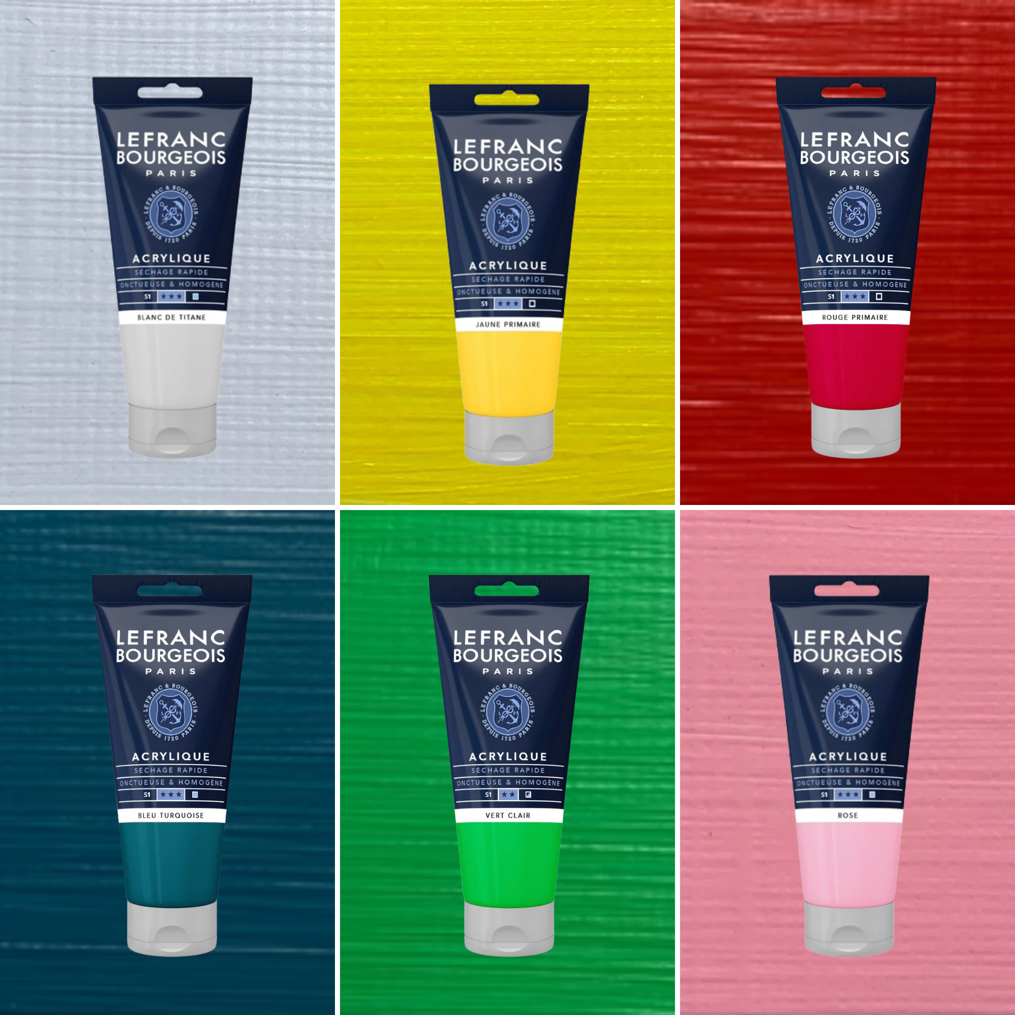 6 x 80ml spring-inspired acrylic colours (Titanium White, Primary Yellow, Primary Red, Turquoise Blue, Light Green, Rose)