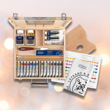 Master oils with our Extra-Fine Oil Classic Set. This exhaustive set has everything you need for oil painting, 14x20ml Extra-Fine Oil tubes, a 40ml tube of Titanium White, four oil additives, two oil brushes, a set of charcoals, a painting knife and a colour chart for the perfect mixes. Presented in an exquisite portable wooden case, it’s the ideal gift for plein air painting and special occasions.