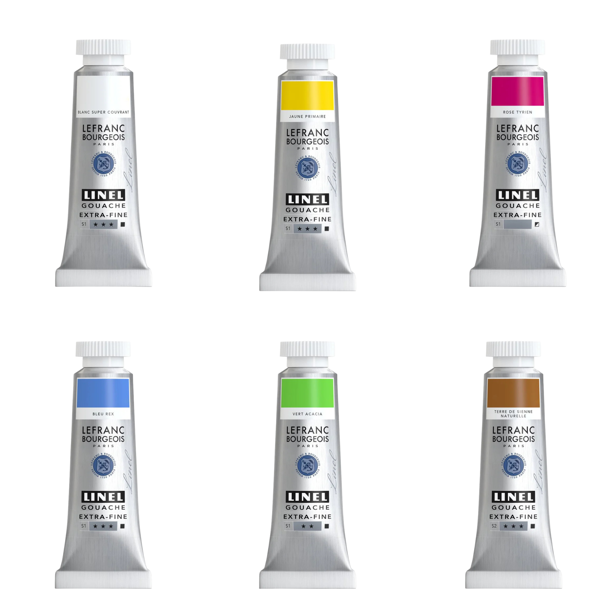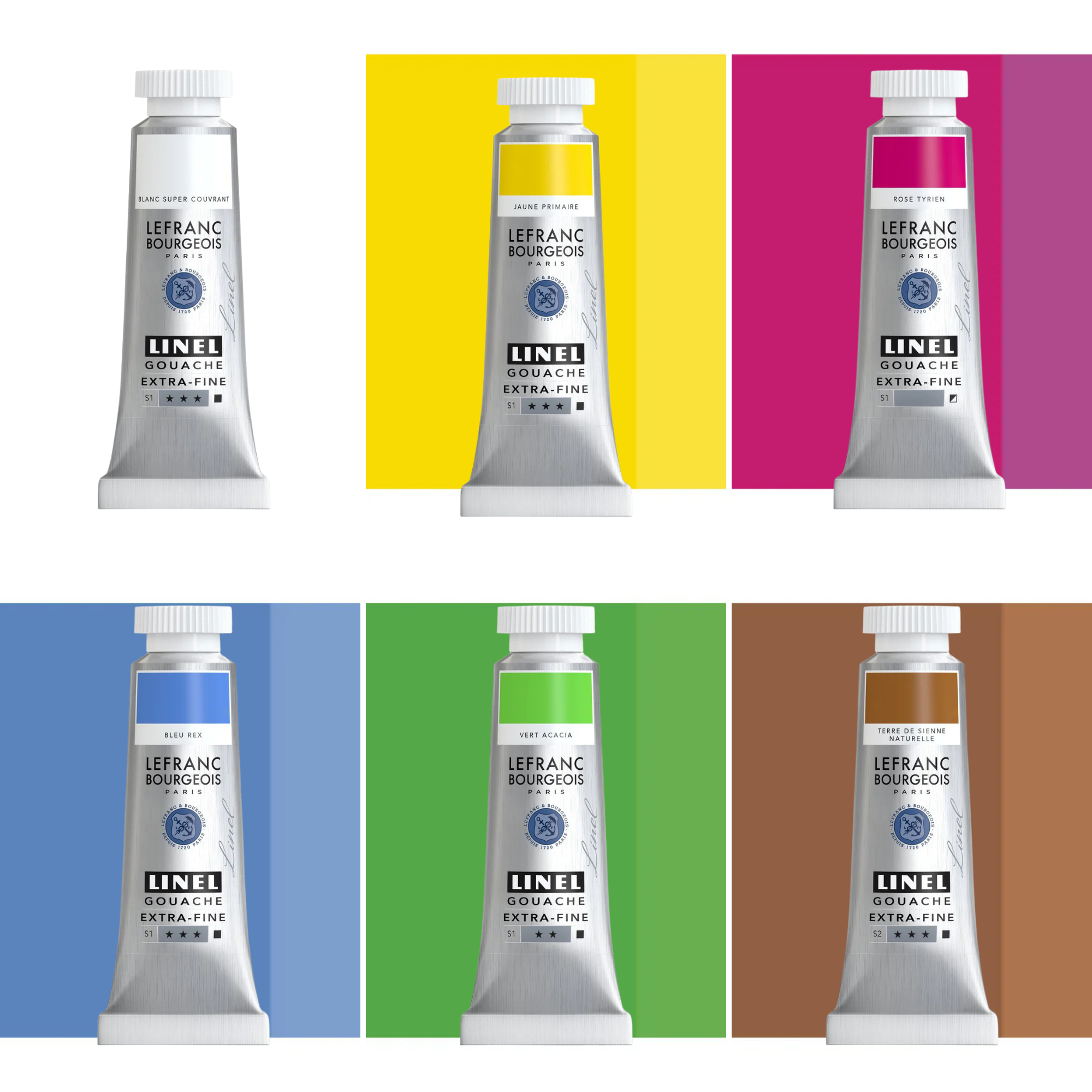 6 x 14ml Linel Extra Fine gouache colours in fresh spring tones (Super hiding White, Primary Yellow, Tyrian Pink, Royal Blue, Acacia Green, Raw Sienna)